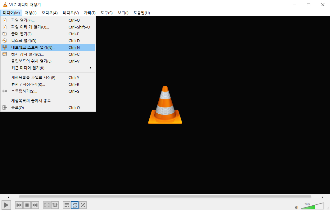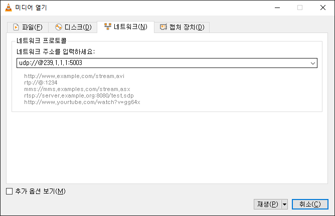 VLC 설치가 끝나셨으면 VLC 플레이어를 실행하고 아래처럼 주소창에 Winsend에서 송출하는 멀티캐스트를 플레이 해 봅니다.