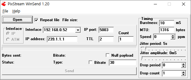 - 해당 파일을 계속 송출하려면 프로그램창에서 Open 버튼 오른쪽의 Repeat file에 체크 해 주시면 됩니다.