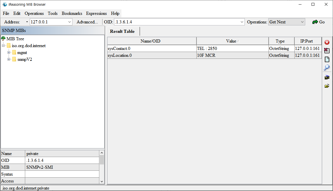위에서 처럼 Address 부분에 MIB 데이터를 수집할 SNMP 에이전트의 IP 주소를 적어주시고 수집 할 원하는 정확한 MIB을 더블클릭 혹은 Get 명령을 보내면 해당되는 MIB 값을 수집 할 수 있습니다.