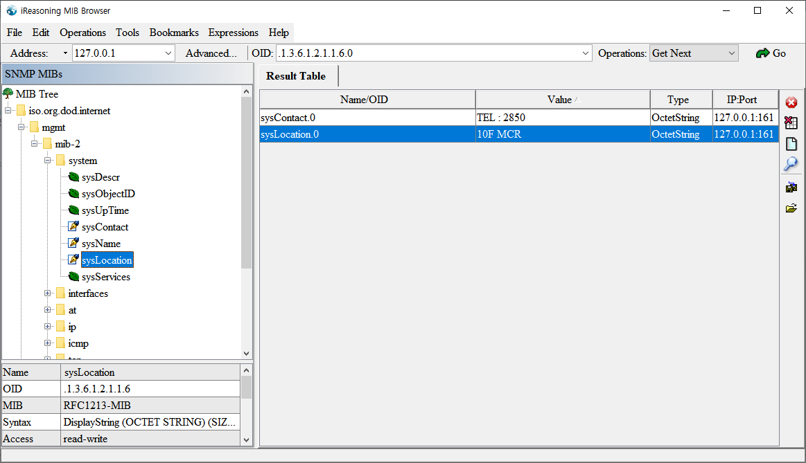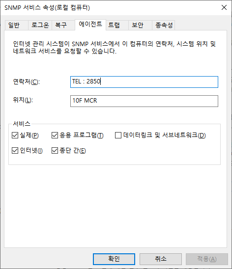 만약 윈도우 10 PC를 관리하고자 할때 윈도우 10의 SNMP 서비스를 기동하고 SNMP 서비스의 담당자, 위치 정보를 입력해 놓으면 MIB 브라우저에서 해당 값을 불러 올 수 있습니다.