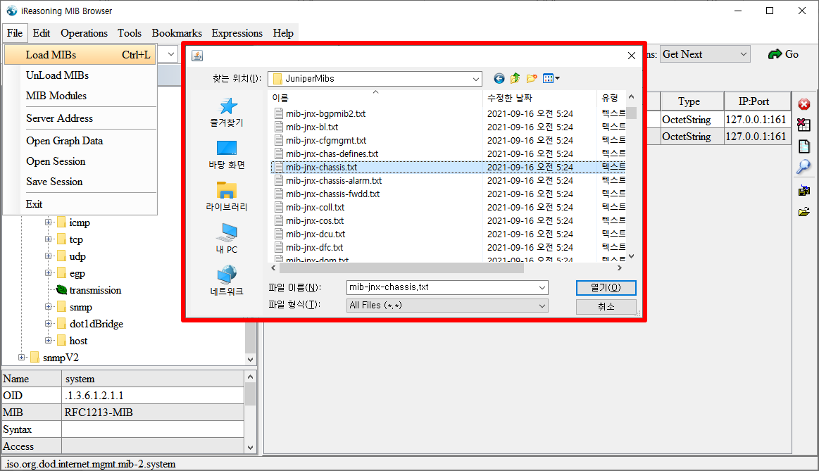 이 상태에서 Private MIB를 Load 해 보면(Juniper Network사의 MIB 중 mib-jnx-chassis MIB을 Load 해 보겠습니다.