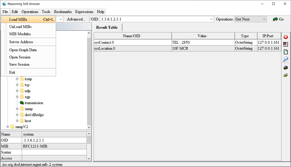 메뉴를 간단히 소개 드리면(거의 모든 MIB 브라우저는 동일한 구조를 가지니 위 소프트웨어를 이해하시면 다른 MIB 브라우저도 사용 하실 수 있습니다.