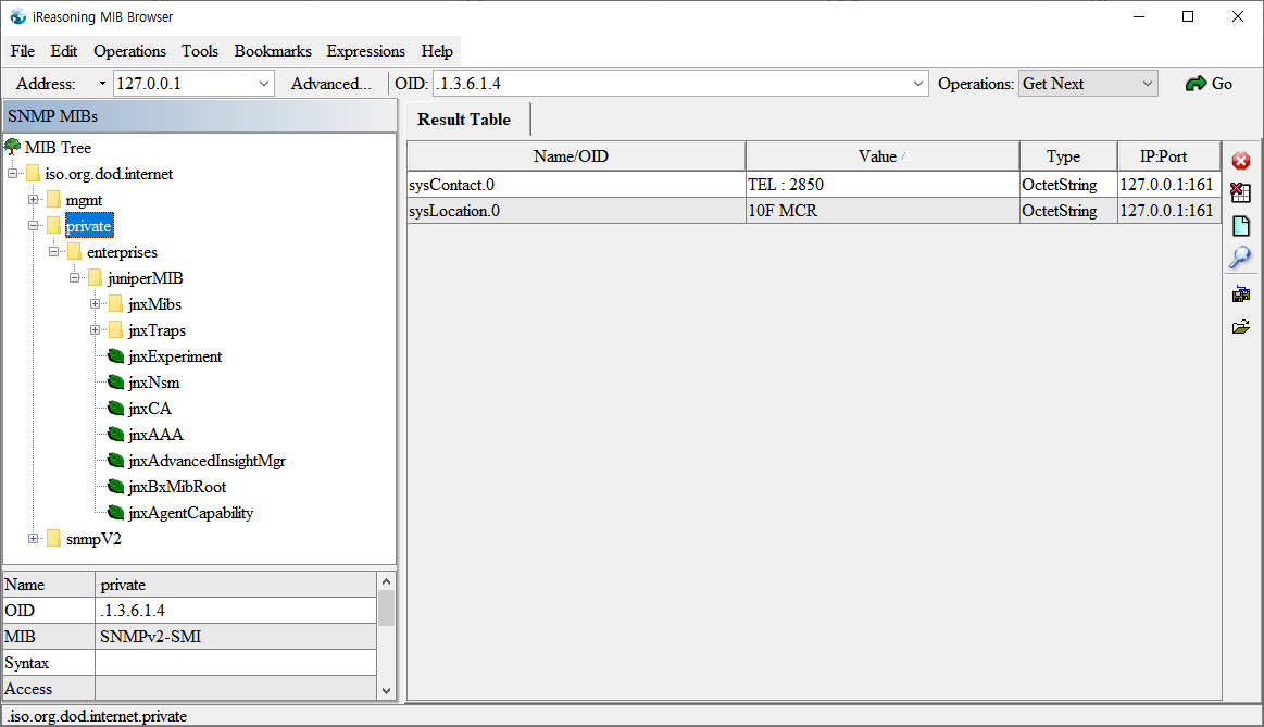 열기를 누르면 MIB 브라우저에서 Juniper Private MIB를 로드 합니다. 로드된 결과를 다시 확인해 보겠습니다.