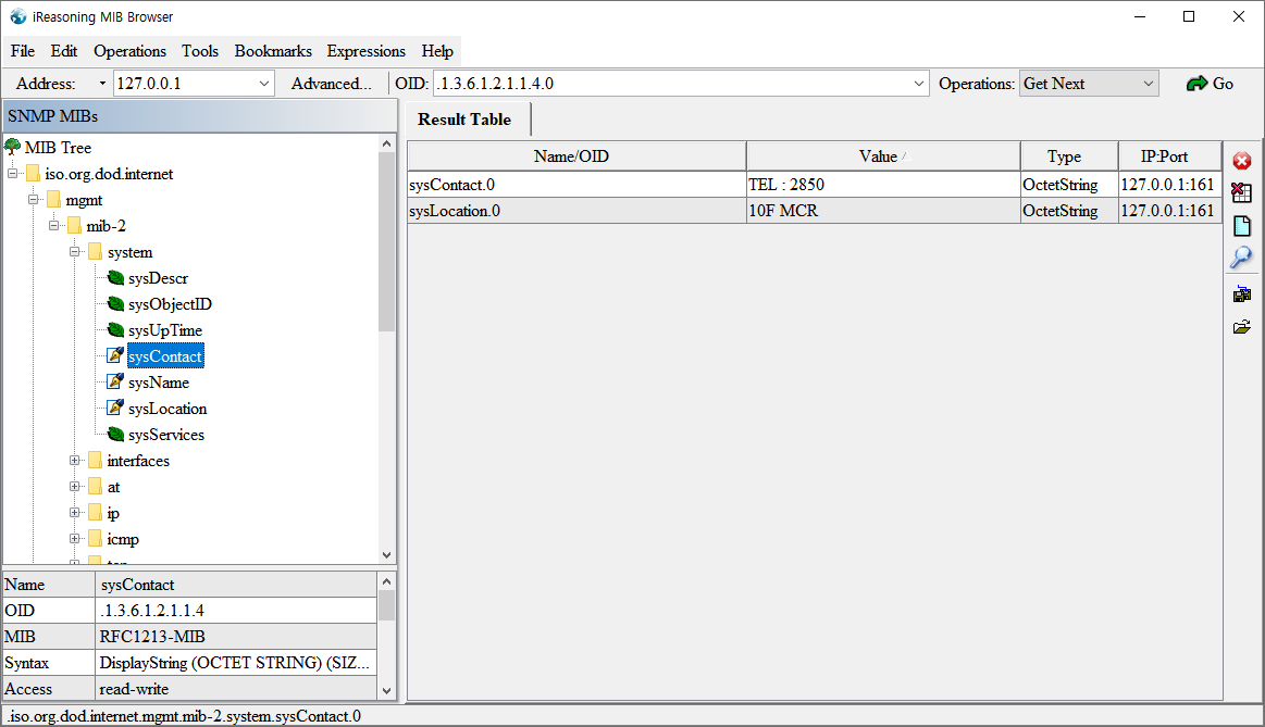 sysContact에 해당하는 OID는 .1.3.6.1.2.1.1.4.0 입니다. 트리의 처음 부분에 나와 있는