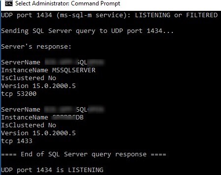 보시다시피 PortQry 도구는 1434/UDP 포트의 가용성뿐만 아니라 SQL 서버의 버전과 SQL 서버에서 실행되는 인스턴스의 이름과 해당 TCP 포트를 보여줍니다. 첫 번째 DBINVENT 인스턴스는 기본 포트 TCP/1433에서 수신 대기하고 두 번째 MSSQLSERVER는 RPC 범위의 고정 TCP/53200 포트를 사용합니다.